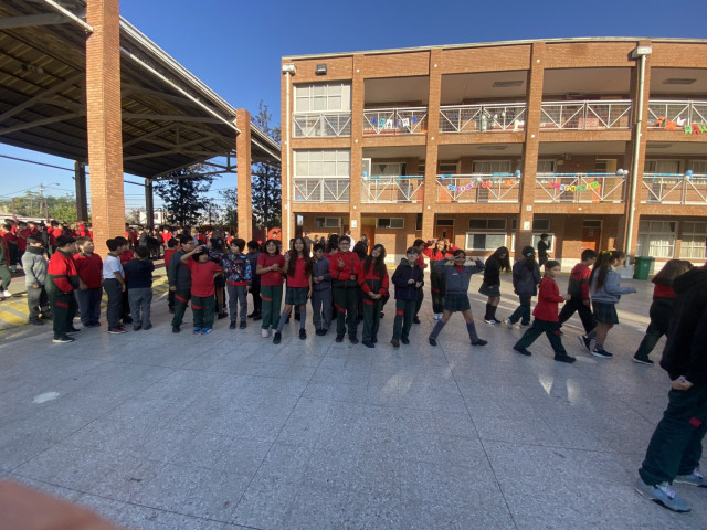Este lunes 2 de septiembre, a las 9:45 horas, el Colegio Teniente Dagoberto Godoy Lo Prado dio la bienvenida al Mes de la Patria con un esquinazo protagonizado por toda la comunidad escolar. El acto comenzó con el canto de tonadas típicas de Chile y la canción nacional, interpretadas por las profesoras Paulina Torres, Magdalena Faúndez, Eduardo Ponce, Claudia Torres y Alejandro Contreras, quienes conforman el grupo “Los 3x7 Dagoberto”.