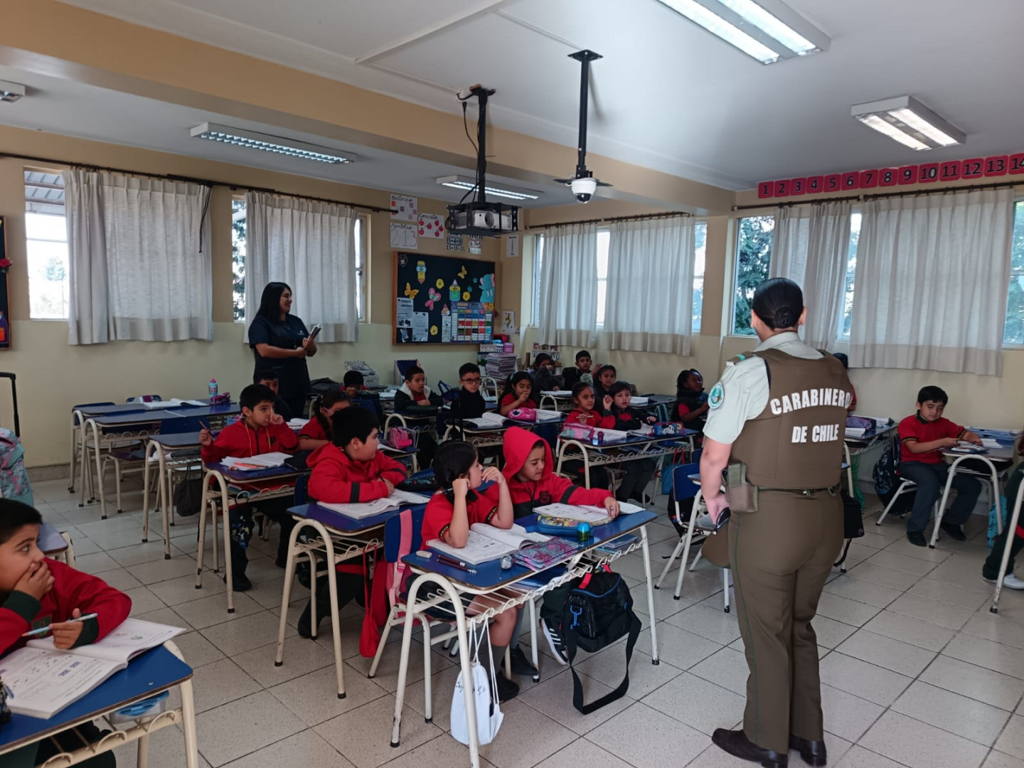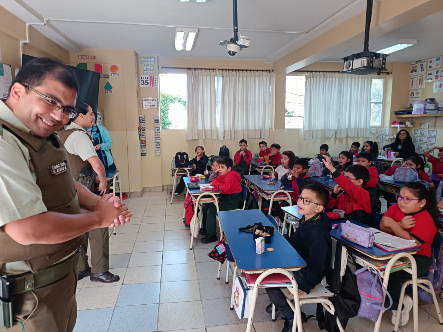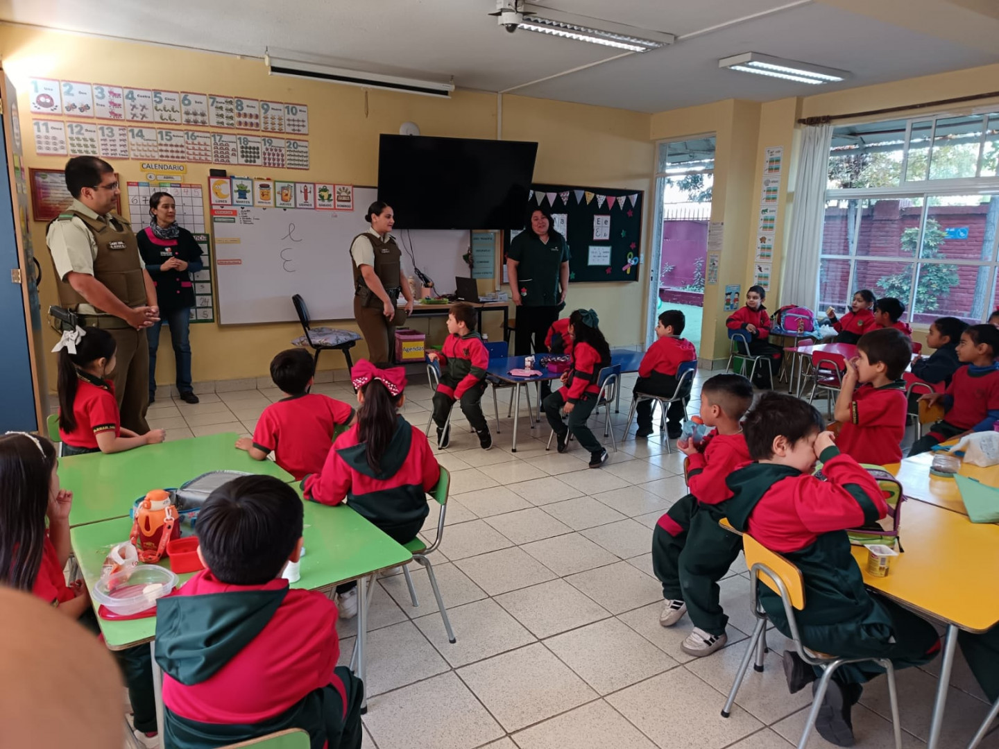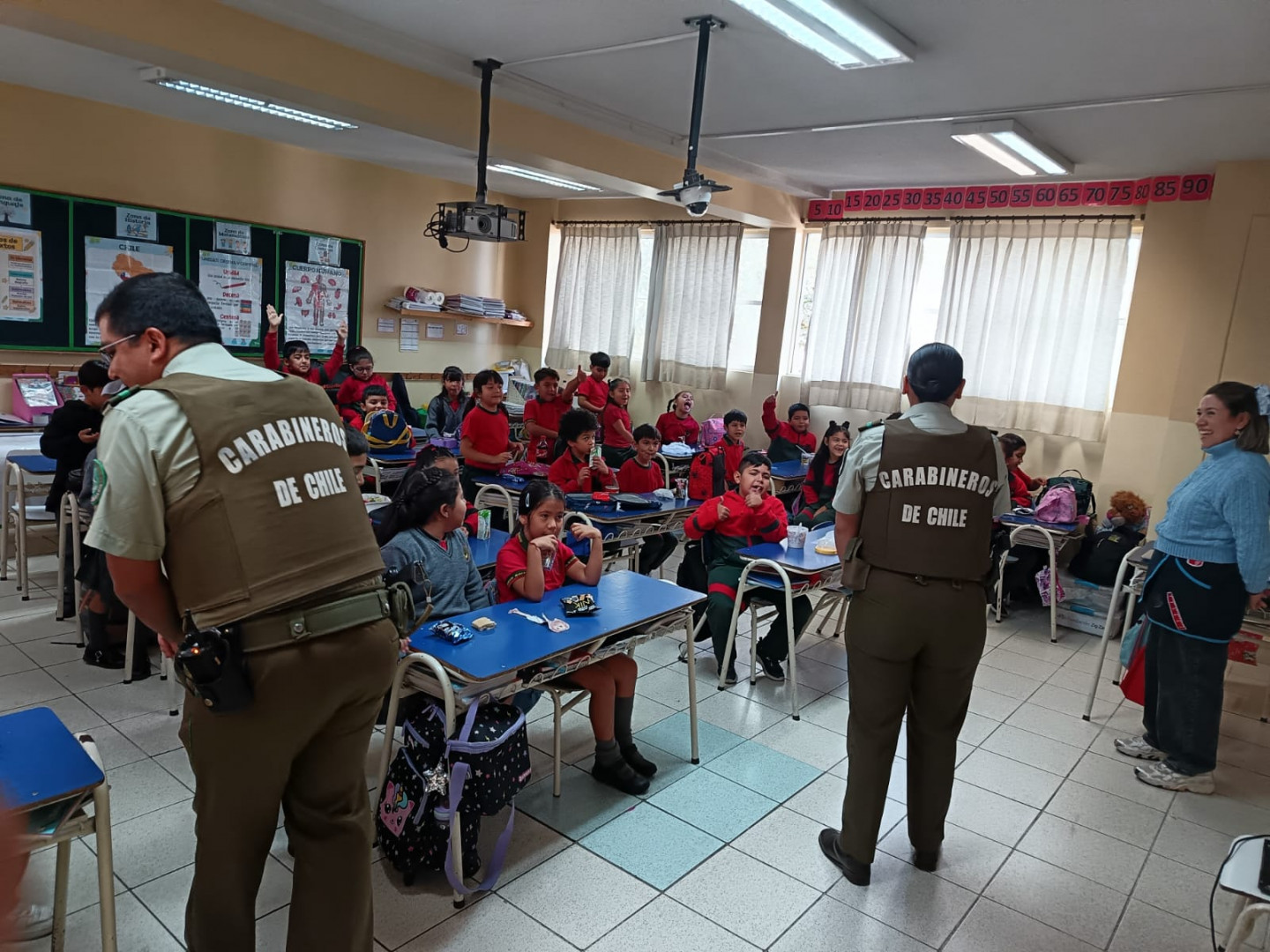 La actividad contempló un recorrido por los cursos de los niveles más pequeños, donde los funcionarios compartieron un espacio cercano y pedagógico con niños y niñas, promoviendo valores como el respeto, la responsabilidad y la sana convivencia escolar. En esta instancia, además, se reforzaron medidas de autocuidado y seguridad personal, orientando a los estudiantes sobre la importancia de no irse con personas desconocidas ni recibir objetos, regalos o alimentos de extraños, fortaleciendo así conductas preventivas esenciales para su bienestar.