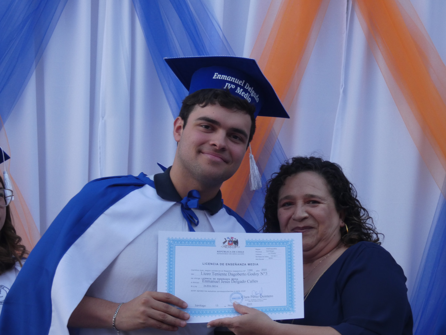 la señora Clara Pérez Quintero ENTREGA el premio a la Mejor Promoción de Enseñanza Media, A ENMANUEL JESUS DELGADO CALLES