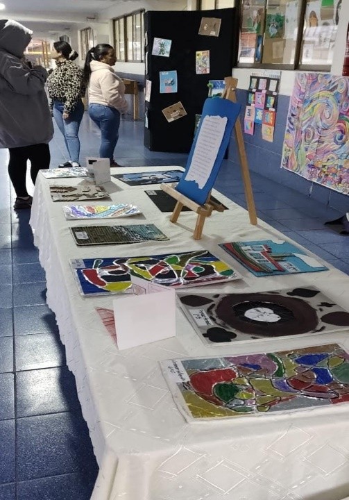 La comunidad educativa pudo apreciar una exposición que reunió los trabajos artísticos desarrollados por estudiantes desde 1° básico hasta III° medio, destacando el uso de diversas técnicas y materiales reciclados.