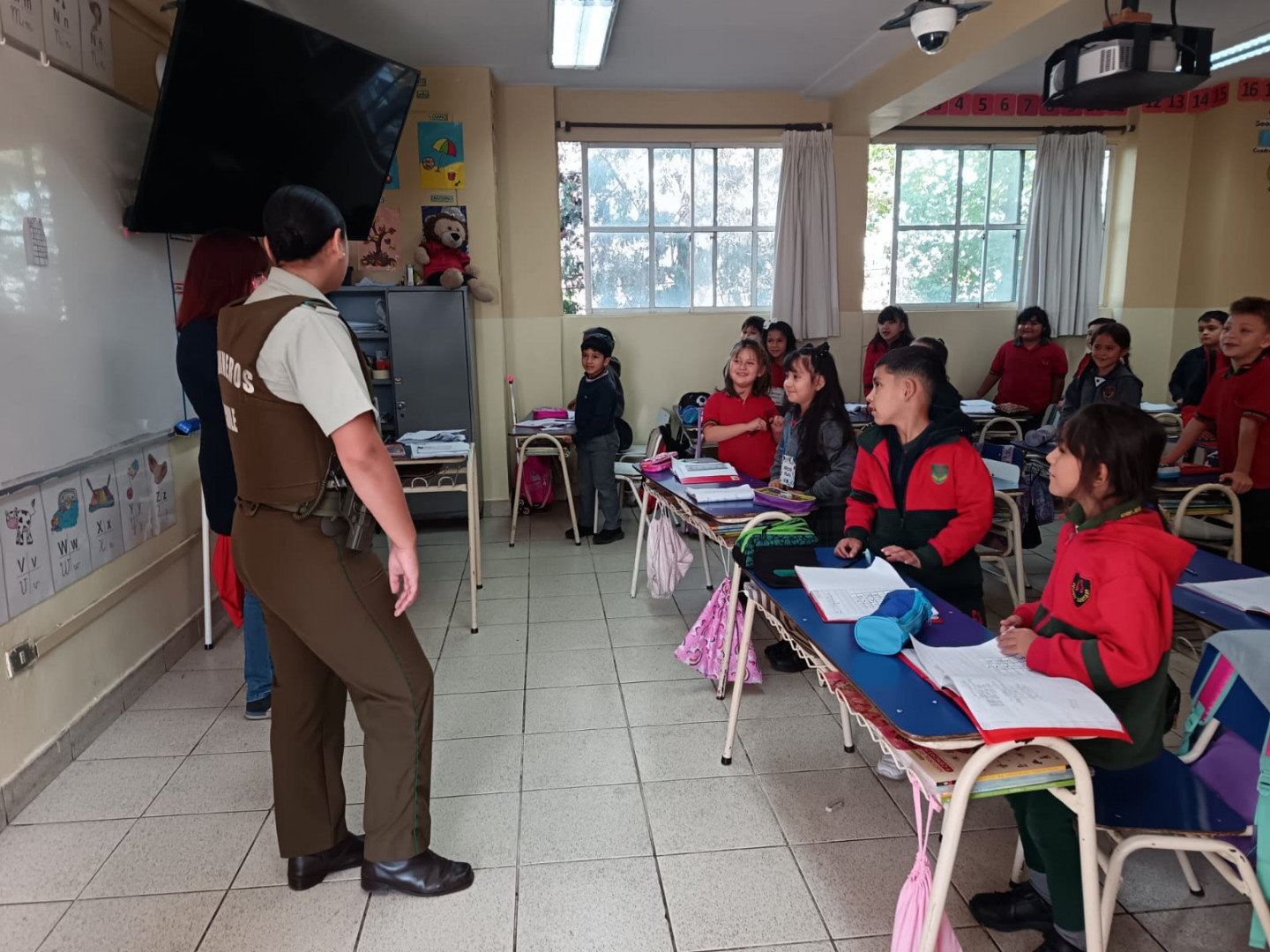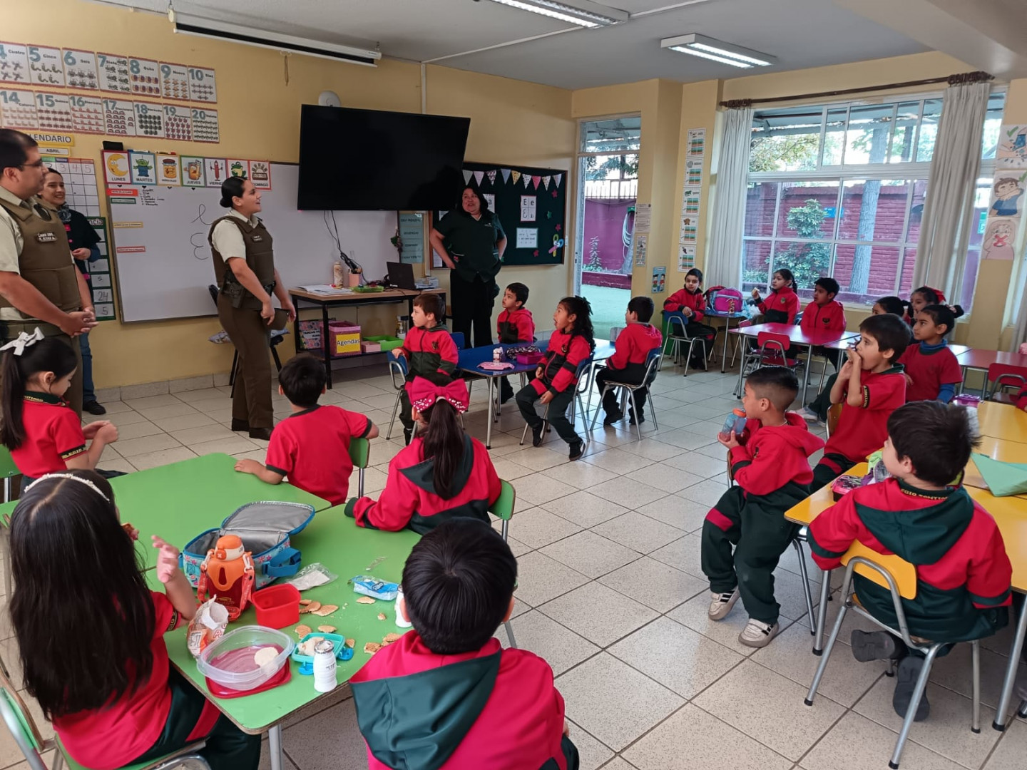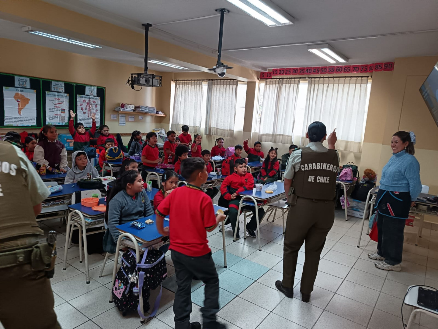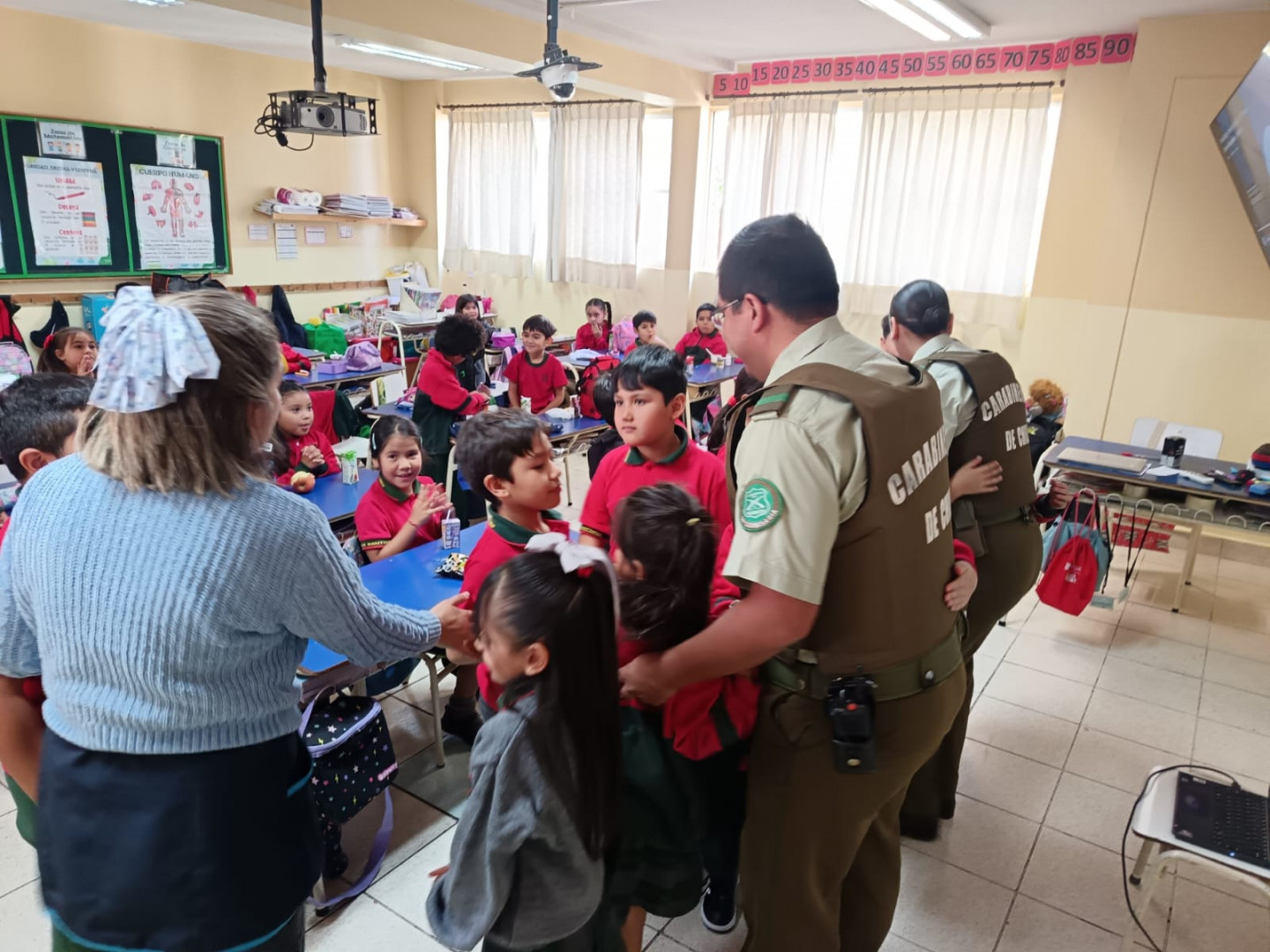 La actividad contempló un recorrido por los cursos de los niveles más pequeños, donde los funcionarios compartieron un espacio cercano y pedagógico con niños y niñas, promoviendo valores como el respeto, la responsabilidad y la sana convivencia escolar. En esta instancia, además, se reforzaron medidas de autocuidado y seguridad personal, orientando a los estudiantes sobre la importancia de no irse con personas desconocidas ni recibir objetos, regalos o alimentos de extraños, fortaleciendo así conductas preventivas esenciales para su bienestar.
