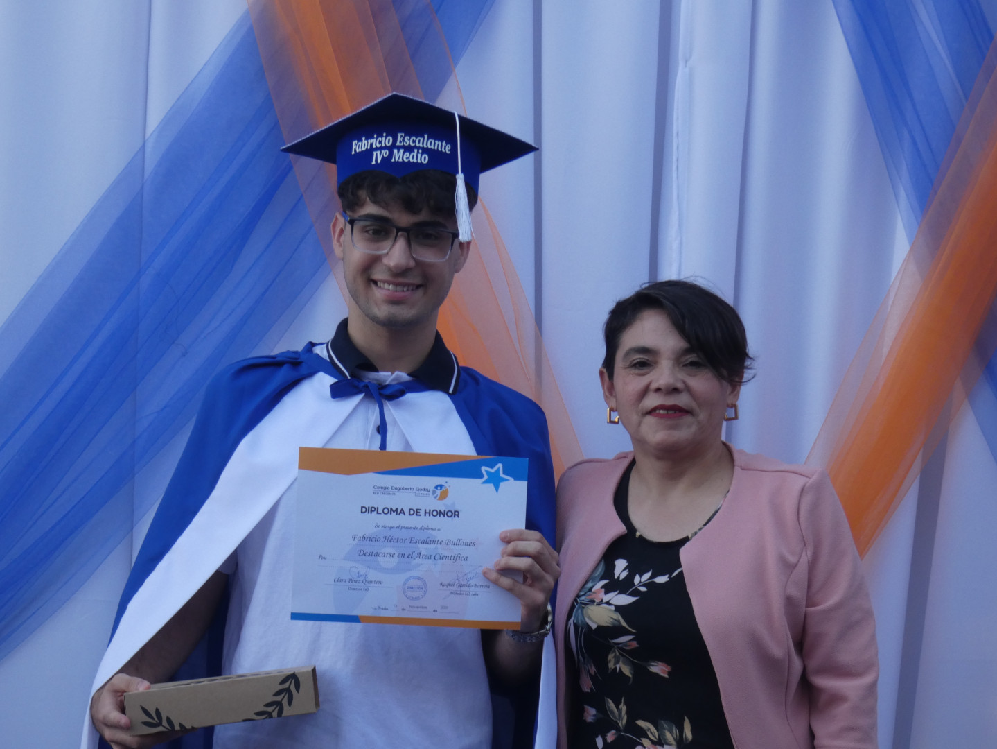 la señora Clara Pérez Quintero ENTREGA el premio a la Mejor Promoción de Enseñanza Media, A ENMANUEL JESUS DELGADO CALLES