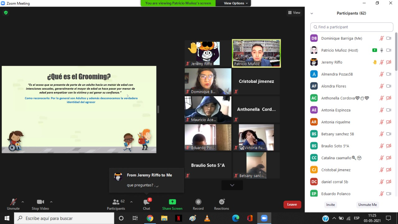 La primera de ellas fue una ronda de charlas sobre la seguridad en Redes Sociales, dirigidas por la fundación Whilolab. Estas se desarrollaron por medio de zoom, los días 9 de abril con profesores/as y 22 y 29 de abril con apoderados/as del colegio.