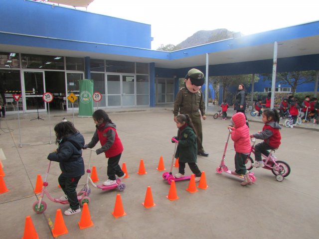 Cerrando la “Semana de la seguridad escolar” la oficina de integración comunitaria de Carabineros de Chile le enseñó a los pequeños de kínder y pre-kinder del Colegio Santiago Emprendedores de San Bernardo sobre educación vial a través de un bici-circuito.