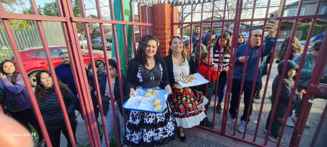 Este 1 de septiembre la comunidad escolar del Colegio Santiago La Florida dio inicio al Mes de la Patria, con el tradicional esquinazo realizado en el frontis del establecimiento. En la ocasión participaron estudiantes, apoderados, docentes y funcionarios, quienes fueron recibidos al inicio de la jornada con el baile típico nacional, acompañado de una degustación de comida típica (empanadas y dulces chilenos).