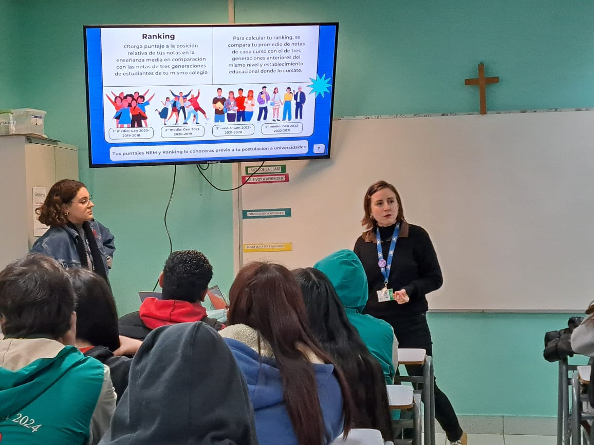 En esta primera charla se abordaron temas como el NEM, Ranking, Fuas, PAES, Vocación, acreditación de las universidades, carreras y páginas para revisar puntajes de corte, requisitos, mallas curriculares de las carreras de interés, entre otros.