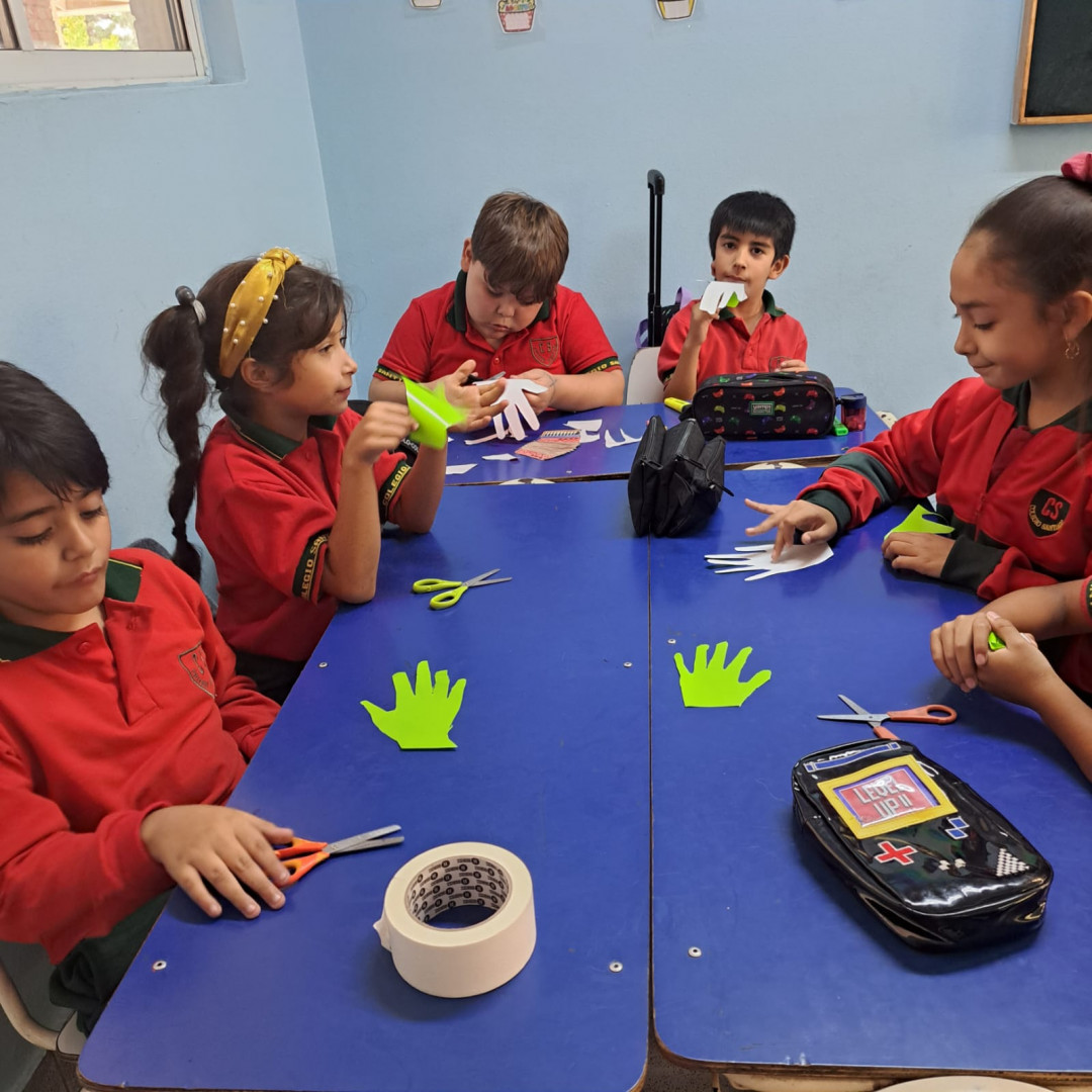 Además, luego de la reflexión y visionado del día, se desarrolló la actividad “En mi cole todos encajan”, donde los y las estudiantes pintaron o decoraron manos de papel que luego pegaron en un papelógrafo.