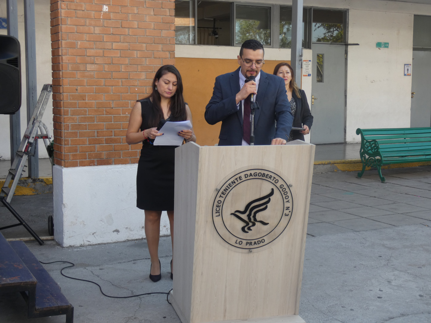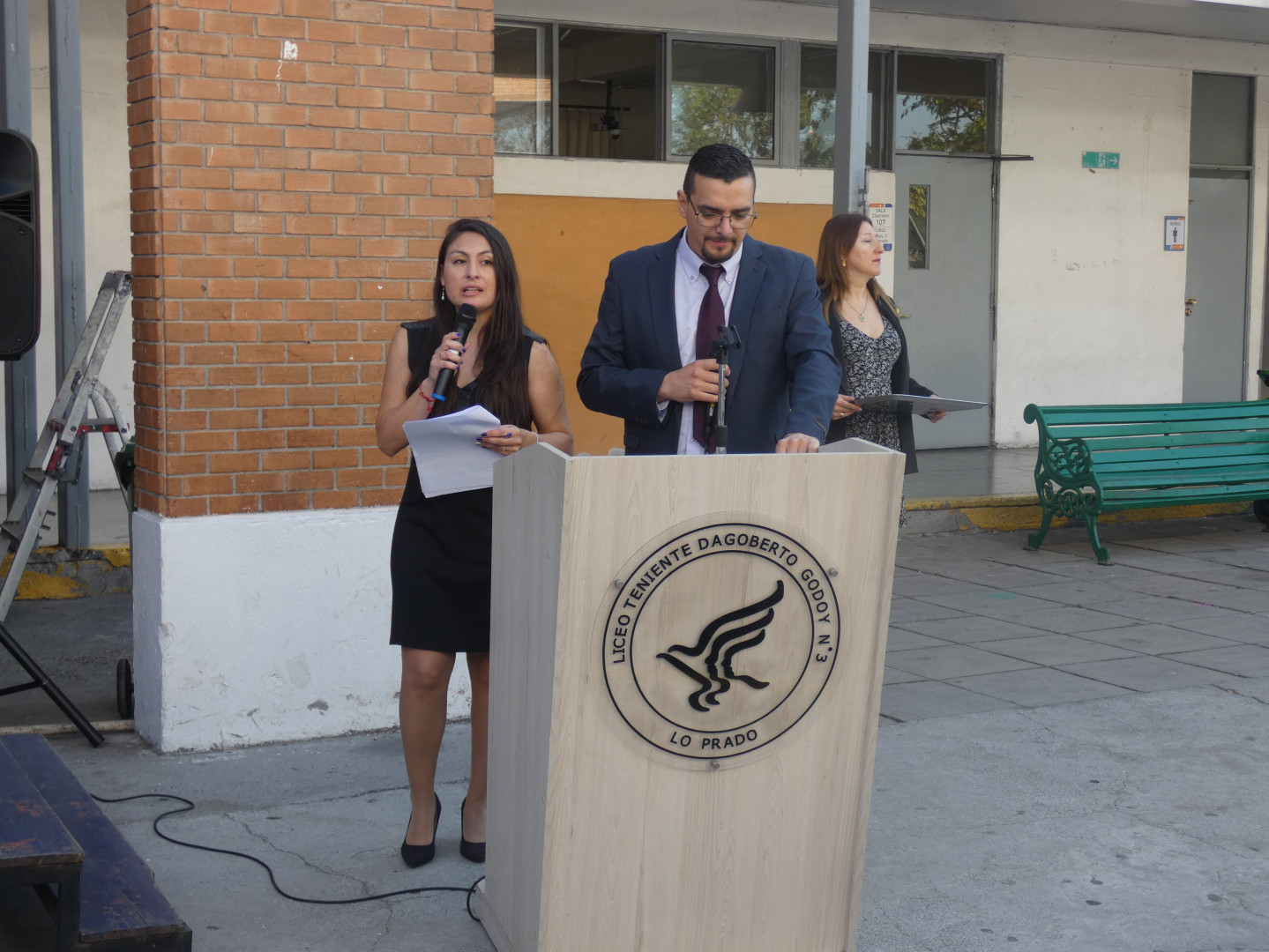 Este lunes 2 de septiembre, a las 9:45 horas, el Colegio Teniente Dagoberto Godoy Lo Prado dio la bienvenida al Mes de la Patria con un esquinazo protagonizado por toda la comunidad escolar. El acto comenzó con el canto de tonadas típicas de Chile y la canción nacional, interpretadas por las profesoras Paulina Torres, Magdalena Faúndez, Eduardo Ponce, Claudia Torres y Alejandro Contreras, quienes conforman el grupo “Los 3x7 Dagoberto”.